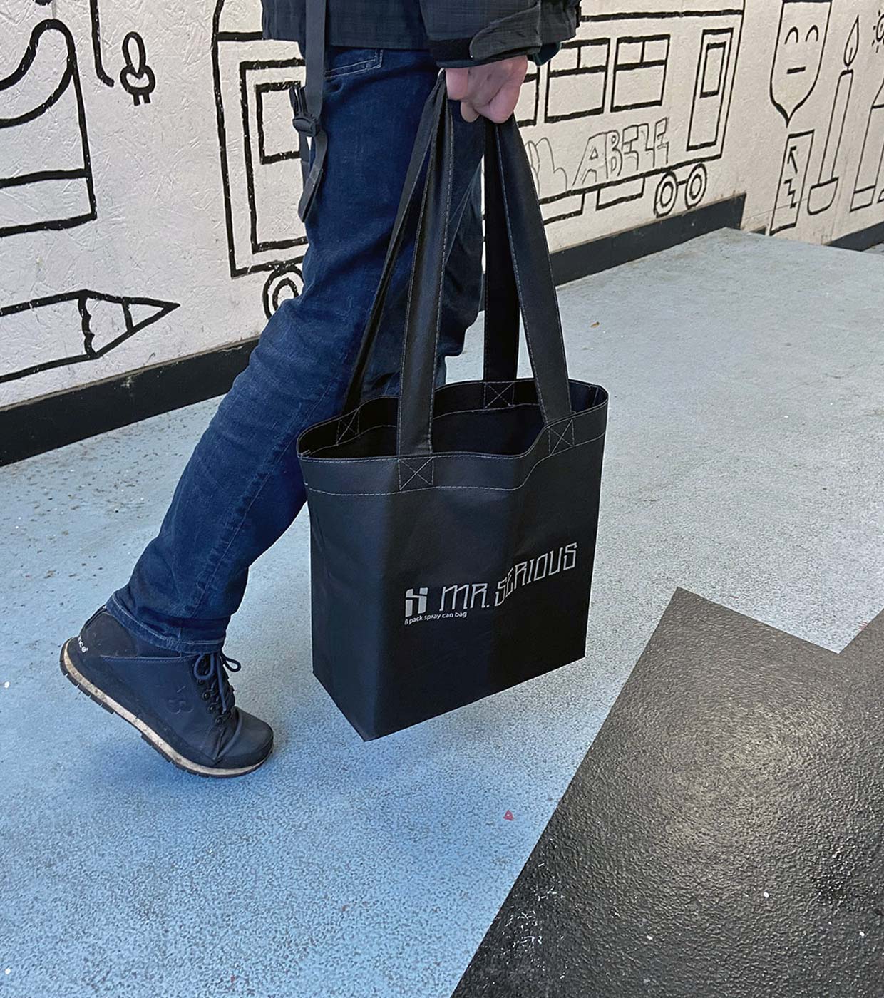 • Non woven fabric. • Strong 4cm handles. • Fits 8 spray cans. (2 Loop boxes of 4 cans) • Size: 45×40cm. Reason to use: Holds 8 cans and a bit more on top.